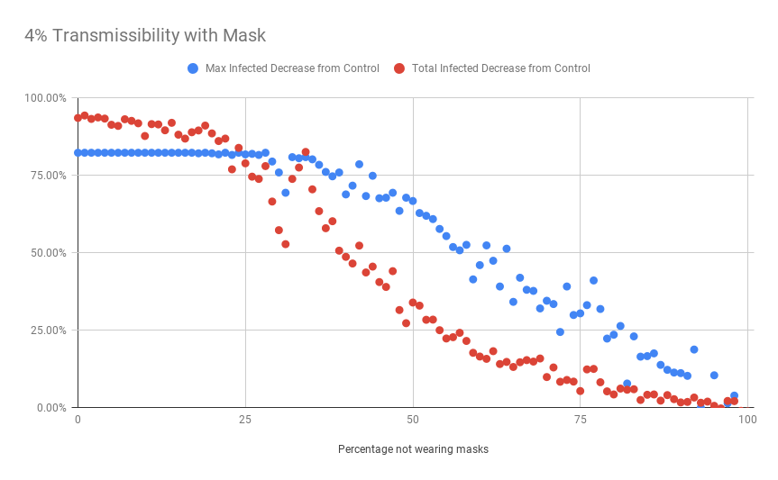 But, as we know, 0% transmissibility is not a realistic model, so let’s look at some other mask efficacies.