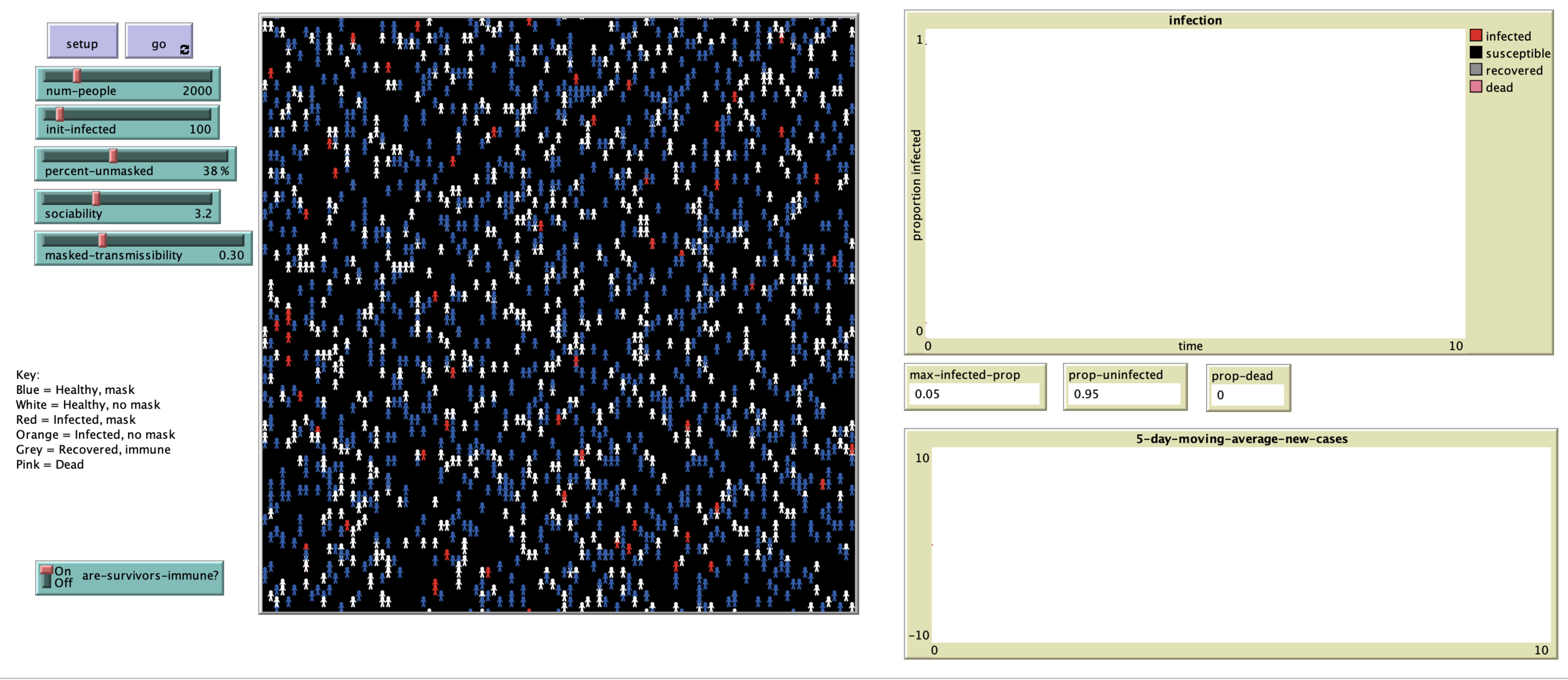 For both realism and simplicity, people are either wearing masks or they aren’t, they can’t put one on once they become infected (in the real world, many spreaders don’t even realize they’re sick until it’s too late).